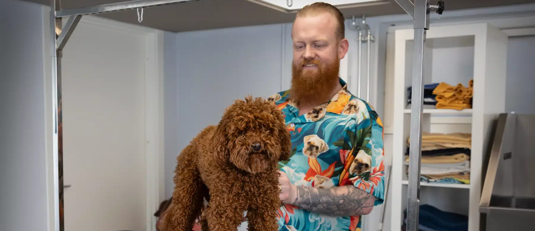 Vi sætter din hunds velvære i centrum. Mit navn er Mikkel, og jeg er manden bag saksen hos FriSørensens Hundesalon i Ballerup – både passioneret hundefrisør og tidligere tømrer. Det var min kærlighed til dyr og et tilfældigt fund af bogen Note from the Grooming Table, der kickstartede rejsen fra savsmuld til shampoo.
